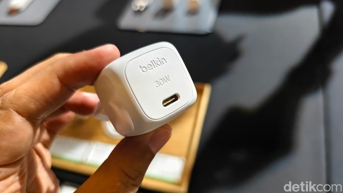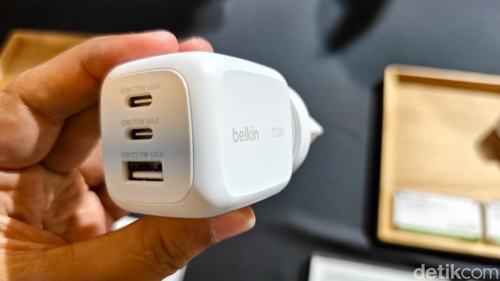 Belkin BoostCharge Pro 70W 3-Port GaN cocok buat charge 3 device sekaligus, MacBook, iPhoneΒ dan AirPods/Watch. Total output 70W (single USB-C hingga 70W untuk MacBook Air/Pro cepat), 2x USB-C PD 3.1 + PPS + 1x USB-A (22.5W). Charge iPhone 16 Pro 0-50% ~27 menit, MacBook Air full speed. GaN tech bikin super kompak, ringan, panas rendah, efisien. Harganya: Rp 899.000. Foto: Adi Fida Rahman/detikINET