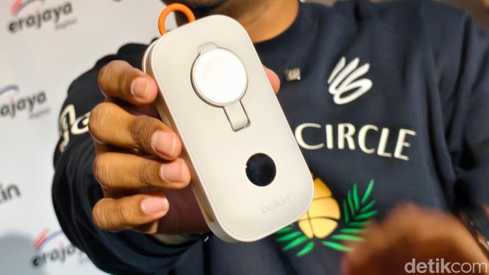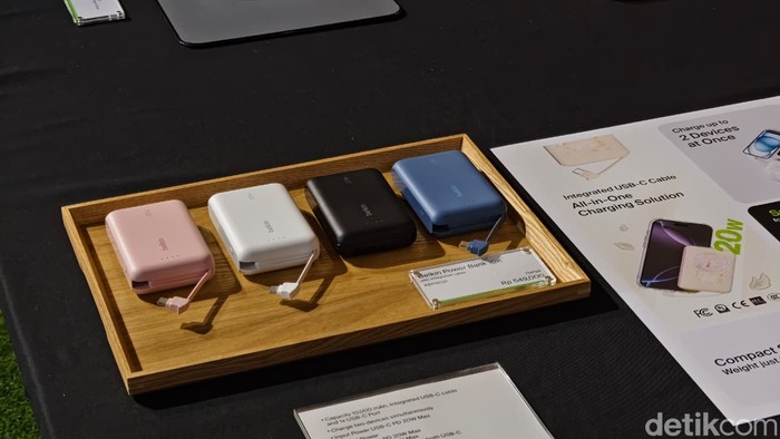 Built-in Apple Watch charger + integrated USB-C braided cable + USB-C port, charge 3 device sekaligus tanpa kabel ribet. Desain slim portable dengan loop gantungan, digital display status real-time, bahan recycled (85% PCR), SmartProtect safety, garansi 2 tahun. Sayangnya perangkat ini belum dijual di Indonesia Foto: Adi Fida Rahman/detikINET