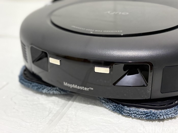 Jika dibalik, Eufy Omni C20 dilengkapi dua bantalan pel yang berguna untuk melakukan kegiatan mengepel lantai setelah kotoran disedot. Foto: Panji Saputro/detikINET
