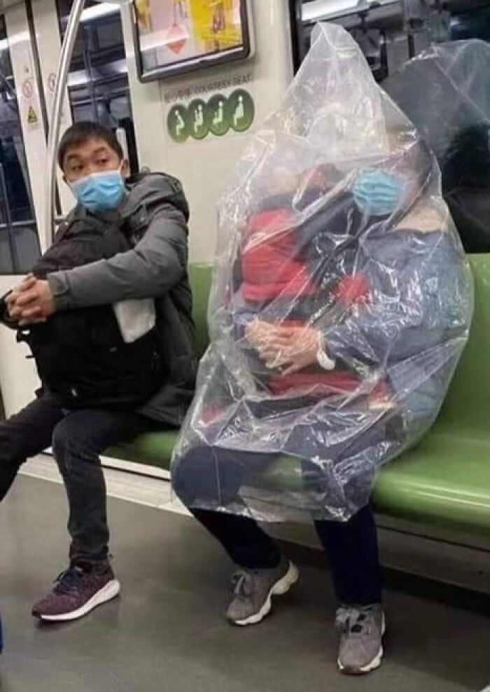 Dan dia memilih pakai plastik. Mungkin saja maskernya benar-benar sudah habis. Dulu masker bahkan sempat langka karena diborong di mana-mana. Foto: Thewatchfuleye via Bored Panda