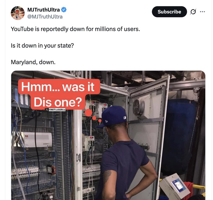 FotoINET Meme Kocak YouTube Down di Seluruh Dunia Pool - detikInet Rabu, 18 Feb 2026 09:45 WIB Tautan telah disalin Jakarta - YouTube down di seluruh dunia, meme pun langsung menyebar di linimasa media sosial. Ramai-ramai ke X, dulunya Twitter, untuk memastikan YouTube apakah benar down. Foto: X.com Sudah lama YouTube tidak mengalami down atau error. Foto: X.com Meme teknisi Google sedang memeriksa penyebab YouTube down. Foto: X.com Yang biasanya makan ditemani video YouTube jadi kecewa. Foto: X.com Twitter atau sekarang X jadi rujukan untuk mencari informasi apakah YouTube down. Foto: X.com "Bagaimana aku bisa makan malam tanpa membuka video YouTube?" Foto: X.com X atau Twitter memang selalu bisa jadi andalan. Foto: X.com Mencoba menyalakan dan mematikan WiFi tapi YouTube tetap error. Foto: X.com Foto: X.com Akun ini mengabarkan Down Detector membenarkan YouTube kena gangguan besar. Foto: X.com (/) TAGS youtube down LIHAT LAINNYA Tautan telah disalin
