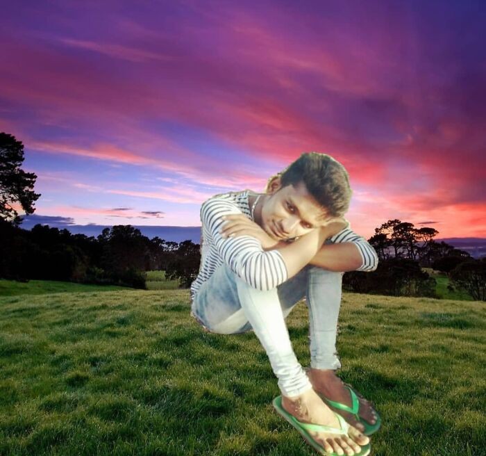 Niat foto estetik saat senja, tapi ukuran tubuh yang tak proporsional bikin hasilnya tampak seperti efek tempel asal-asalan. Foto: Demilked