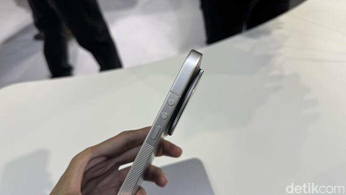 Desain tombol power dan volumenya sama seperti Xiaomi 17 Ultra, tapi sisi kanan dan kiri Leica Leitzphone dihiasi aksen bergerigi yang juga ditemukan di cincin kamera. Foto: Virgina Maulita Putri/detikINET