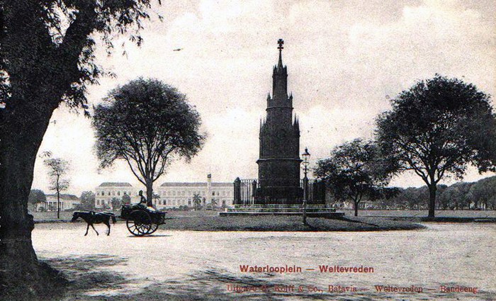 Lapangan Banteng dulu dihiasi menara peringatan kebebasan belanda atas pendudukan perancis, menara itu kini dipindahkan ke museum prasasti. Foto: Istimewa/Colletie Tropenmuseum