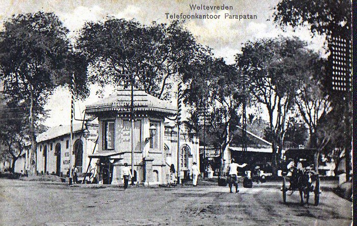 Gedung telekomunikasi, digedung ini pertama kali digunakanya telepon di Batavia, terletak di perempatan Tugu Tani, Kebon Sirih, Jakarta Pusat. Foto: Istimewa/Colletie Tropenmuseum