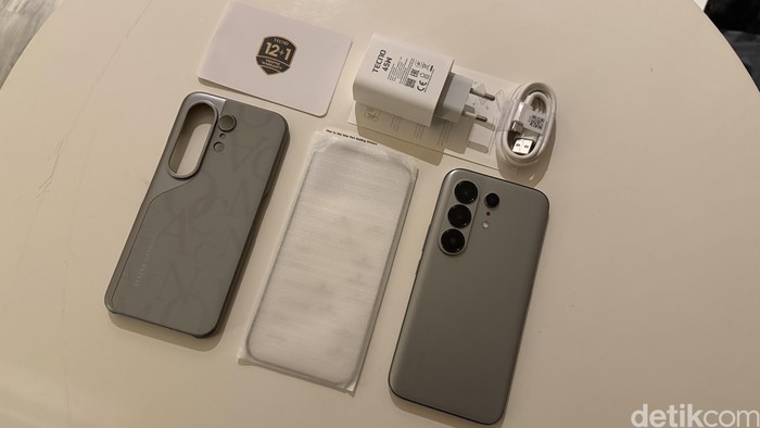 Tecno Camon 50 Pro 5G dilengkapi aksesoris seperti charger 45W, kabel USB-C, case pelindung dengan pola 'CAMON', kaca pelindung, SIM ejector, dan booklet manual. Foto: Virgina Maulita Putri/detikINET