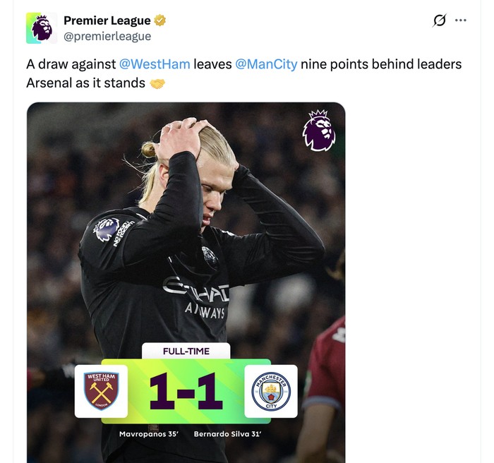 Draw melawan West Ham membuat City ketinggalan 9 poin dari Arsenal. Foto: X.com
