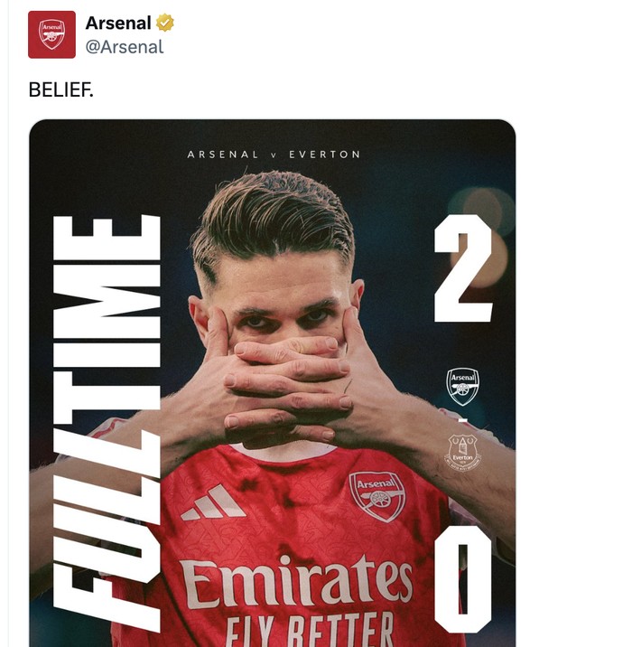 Arsenal menang 2-0 atas Everton. Foto: X.com
