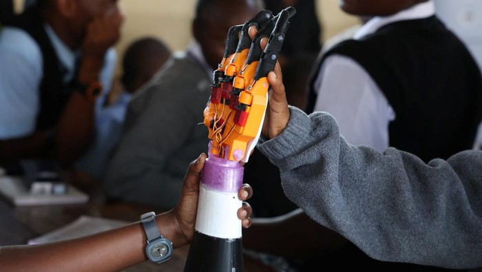 Salah satu insinyur yang terlibat dalam pengembangan teknologi ini, Martha Wanjiru, turut mendampingi para siswa saat mencoba lengan robot tersebut. Ia menjelaskan bahwa inovasi ini dirancang untuk mendukung proses pembelajaran yang lebih inklusif dan interaktif.Β REUTERS/Monicah Mwangi