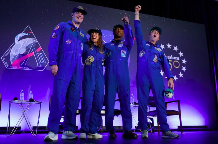 Para kru Artemis II, dari kiri, Jeremy Hansen, Christina Koch, Victor Glover, dan Reid Wiseman naik ke panggung di perayaan kembalinya kru ke Bumi di Ellington Field di Houston, Texas, pada Sabtu 11 April. Foto: NASA