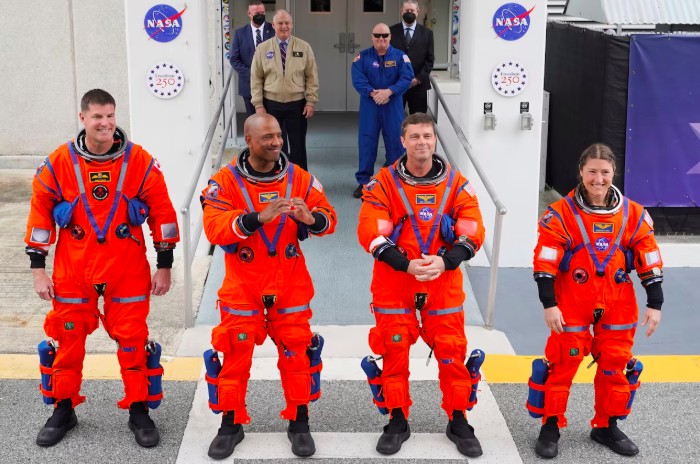 Para anggota kru Artemis II, dari kiri ke kanan yaitu spesialis misi Jeremy Hansen, pilot Victor Glover, komandan Reid Wiseman, dan spesialis misi Christina Koch, menuju Landasan Peluncuran 39B di Kennedy Space Center untuk lepas landas pada 1 April 2026. Foto: NASA