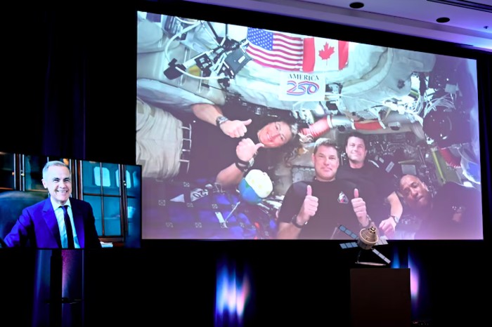 Perdana Menteri Kanada Mark Carney berbicara kepada kru Artemis II selama siaran langsung di markas besar Badan Antariksa Kanada di Longueuil, Quebec, pada 8 April. Foto: NASA