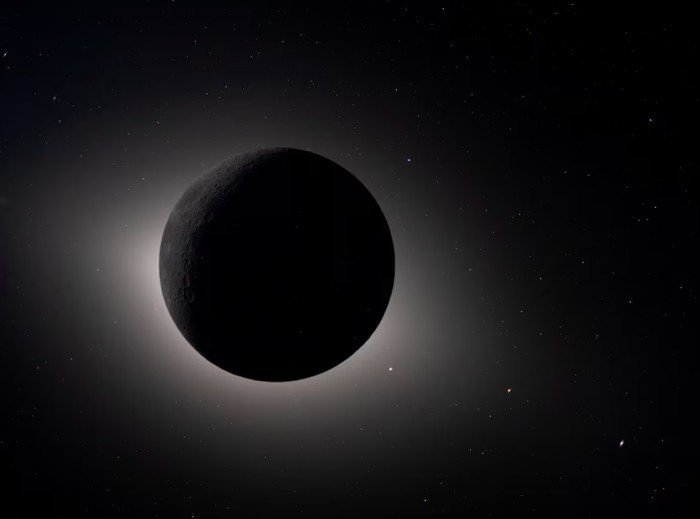 Matahari tertutupi sepenuhnya oleh Bulan selama penerbangan lintas Bulan oleh awak Artemis II, 7 April. Planet Merkurius, Mars, dan Saturnus (dari kiri ke kanan) dapat dilihat di kanan bawah. Foto: NASA