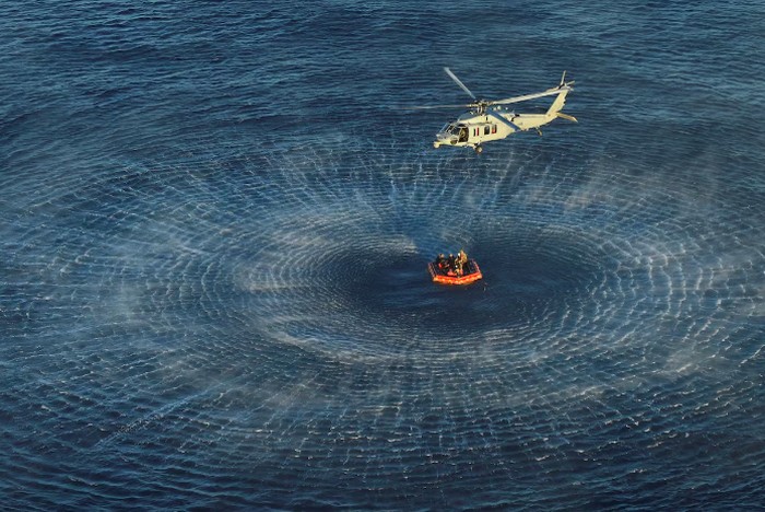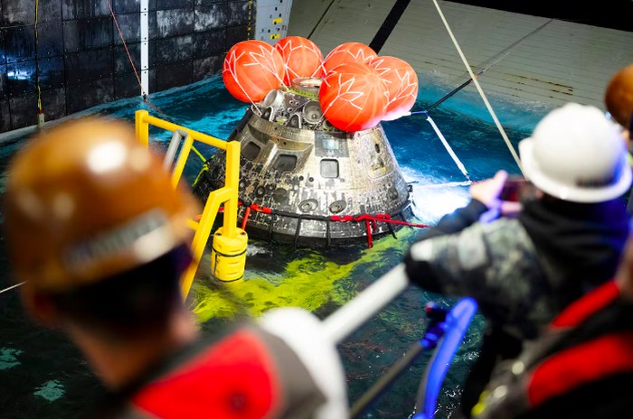 Pesawat ruang angkasa Orion milik NASA terlihat saat tim Pendaratan dan Pemulihan NASA, bersama dengan personel Angkatan Laut AS, berupaya memulihkan pesawat ruang angkasa tersebut ke dek lambung kapal USS John P. Murtha. Foto: NASA