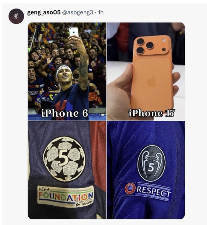 Dari era iPhone lawas hingga generasi terbaru, satu hal tak berubah: trofi Liga Champions belum juga kembali ke tangan Barcelona. Foto: X.com