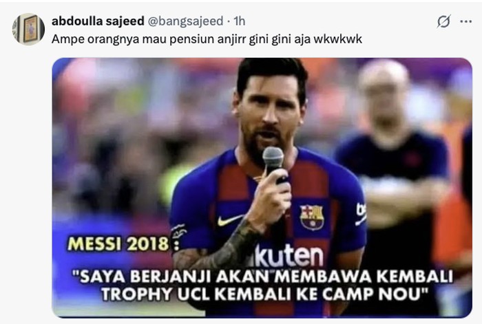 Janji lama kembali viral. Ucapan Lionel Messi soal membawa pulang trofi UCL kini jadi bahan candaan pahit. Foto: X.com