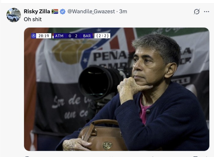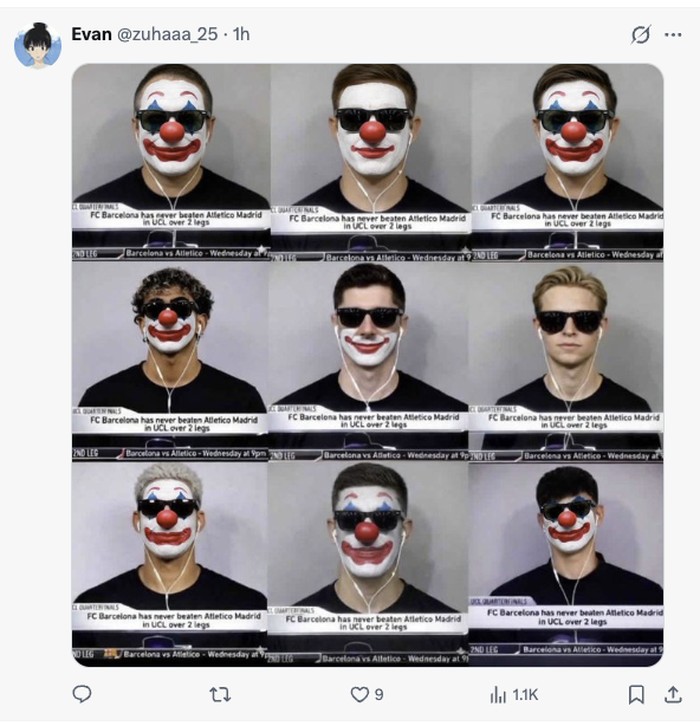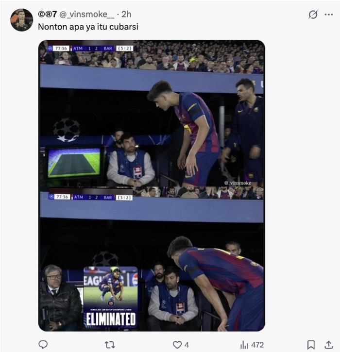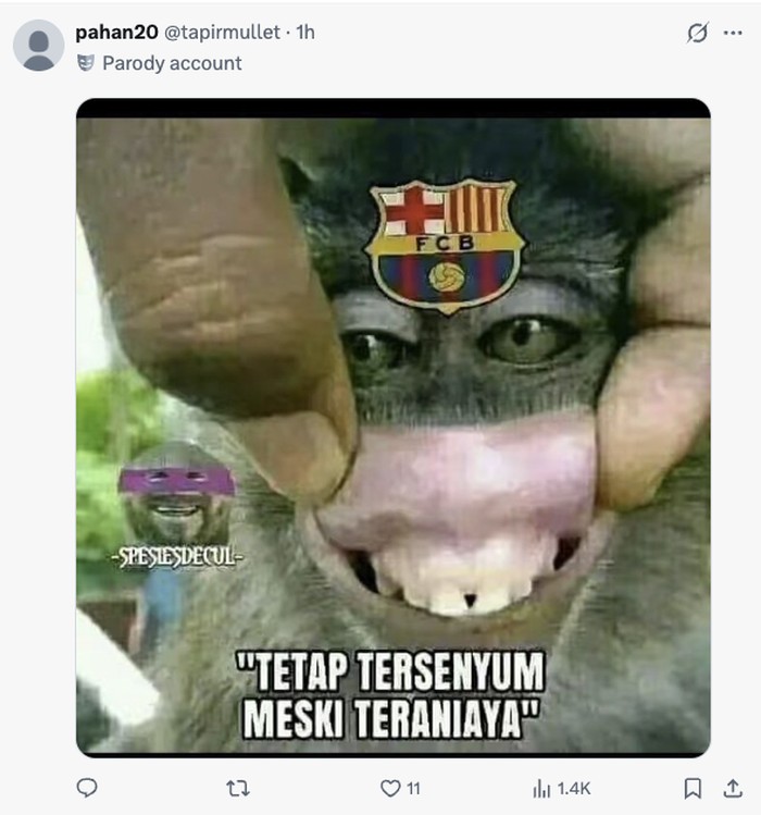 β€œTetap tersenyum meski teraniaya.” Ungkapan satir yang menggambarkan perasaan fans Barca tiap musim UCL. Foto: X.com