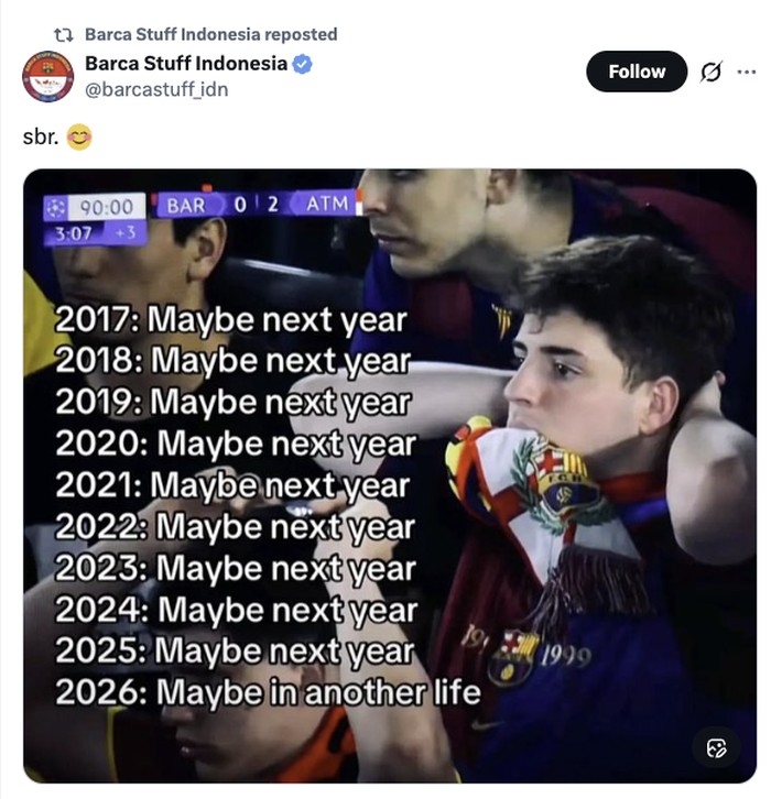 β€œMaybe next year” jadi mantra tahunan. Dari 2017 hingga kini, harapan fans Barcelona terus berulang tanpa hasil. Foto: X.com