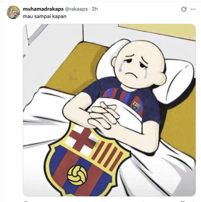 Menunggu tanpa kepastian. Meme ini menggambarkan penantian panjang fans Barcelona yang belum juga berbuah trofi. Foto: X.com