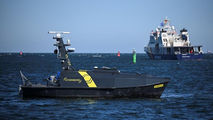 Sebuah kapal tanpa awak permukaan (USV) bernama Stormborn terlihat berada di pintu masuk pelabuhan. Kehadirannya digunakan untuk menguji solusi industri dalam meningkatkan kesadaran situasional di area maritim. REUTERS/Annegret Hilse