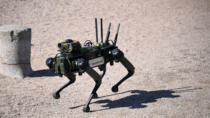 Robot anjing (UGV) turut dilibatkan dalam demonstrasi militer untuk perlindungan pelabuhan. Perangkat tersebut terlihat berjalan serta menjalankan berbagai fungsi operasional di lapangan. REUTERS/Annegret Hilse