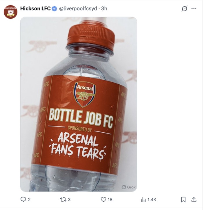 βArsenal Oyeeeβ¦ Tapi hari ini malah jadi βArsenal Oh Noooβ¦β Satu gol Haaland = Air mata langsung banjir. Bottle Job FC strikes again!β Foto: X.com