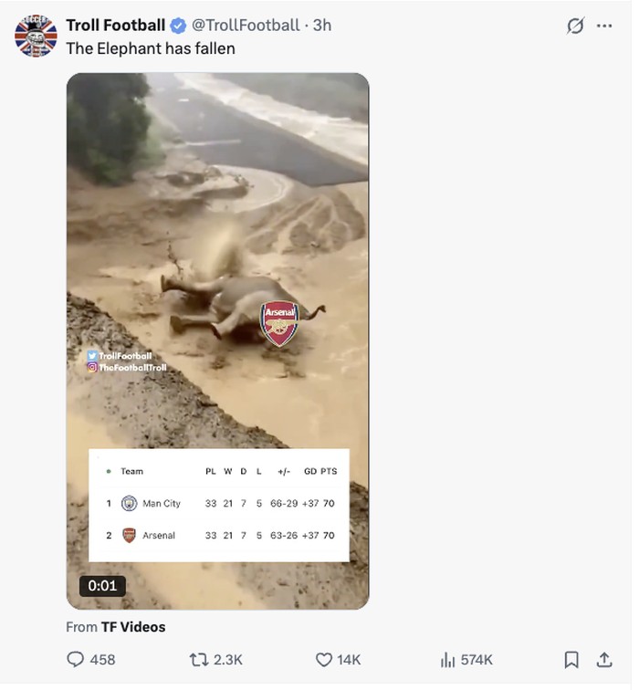 βTHE ELEPHANT HAS FALLEN Dari puncak klasemenβ¦ langsung terjun bebas ke posisi 2. Manchester City: Terima kasih Haaland Arsenal: β¦ β Foto: X.com