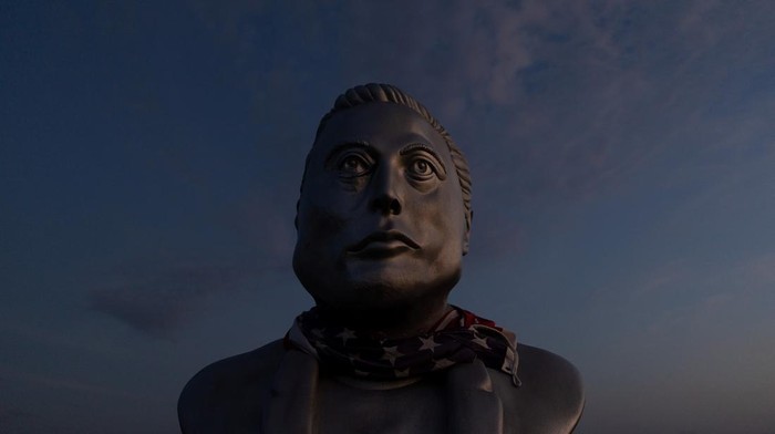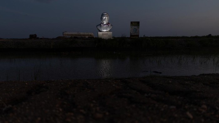 Sebuah mural dan patung yang menggambarkan Elon Musk menjadi sorotan di kawasan Starbase, di tengah meningkatnya perhatian publik terhadap rencana perusahaan antariksa SpaceX yang dikabarkan bersiap melangkah ke penawaran umum perdana atau IPO. REUTERS/Carlos Barria