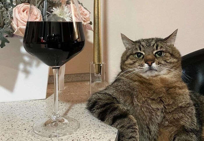 Ini adalah Stepan, kucing asal Ukraina yang menjadi sensasi internet. Ia terkenal karena pose-posenya yang sangat acuh tak acuh dan santai di depan meja dengan segelas minuman (seringkali wine atau koktail) dan musik latar yang melankolis. Foto: Boredpanda