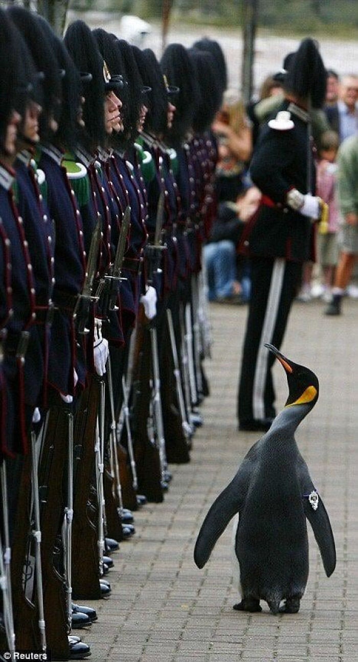 Pinguin ini bukan pinguin biasa. Ia adalah Nils Olav, seekor pinguin raja di Kebun Binatang Edinburgh yang merupakan Maskot dan Kolonel Utama Garda Raja Norwegia. Di foto ini, ia sedang melakukan inspeksi pasukan. Ia bahkan sudah dianugerahi gelar ksatria (Knighthood). Foto: Boredpanda