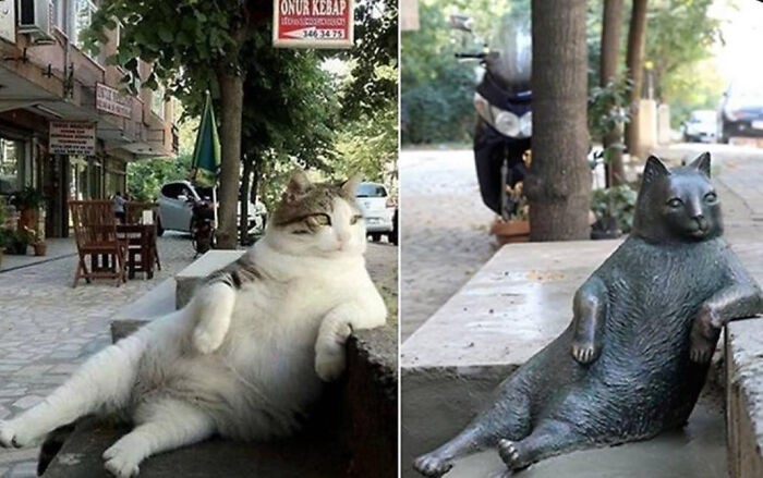 Foto kiri menunjukkan Tombili, kucing jalanan di Istanbul, Turki, yang viral karena posenya yang sangat manusiawi saat bersantai di trotoar. Setelah ia mati pada 2016, warga setempat membuatkan patung perunggu di lokasi yang sama (foto kanan) untuk mengenangnya. Foto: Boredpanda
