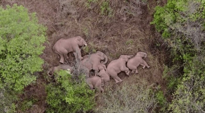 Foto udara ini menunjukkan kawanan gajah di Yunnan, Tiongkok, yang sedang beristirahat saat melakukan perjalanan migrasi panjang sejauh ratusan kilometer pada tahun 2021. Momen mereka tidur bersama ini sangat jarang tertangkap kamera. Foto: Boredpanda