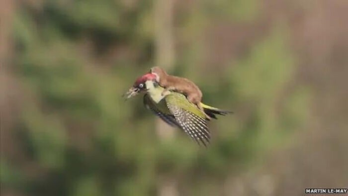 Foto luar biasa ini diambil oleh Martin Le-May di London Timur. Meskipun terlihat seperti mereka sedang berteman, sebenarnya itu adalah upaya serangan. Musang tersebut mencoba memangsa burung pelatuk hijau tersebut, dan burung itu terbang membawa musang di punggungnya untuk menyelamatkan diri. Foto: Boredpanda
