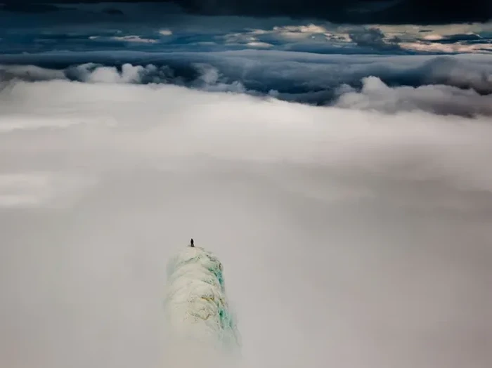 Seorang pendaki berdiri di atas gunung di Islandia. Kelihatan tidak? Sungguh ini dunia di atas awan. Foto: via BrightSide