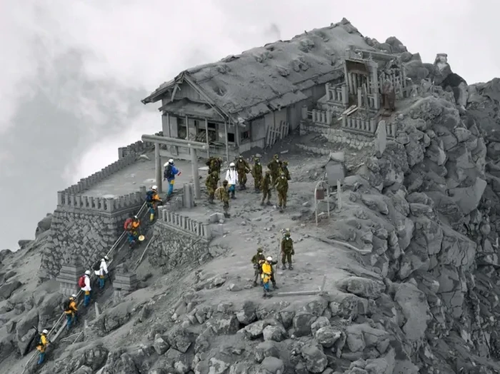 Ini adalah sebuah kuil Shinto yang tertutup abu vulkanik dari letusan gunung berapi Ontake, Jepang. Foto: via BrightSide