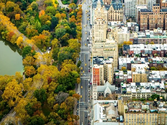 Hutan kota Central Park di sebelah kiri dan hutan beton dan gedung pencakar langit Manhattan di Kota New York di sebelah kanan. Tampak seperti ada pemisah di antara dua dunia berbeda. Foto: via BrightSide