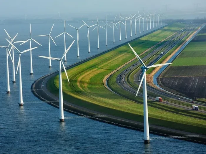 Bukan editan AI yang eror, tapi memang kincir pembangkit listrik ini di atas laut, di samping sebuah jalan tol di Belanda yang tampak seperti negeri dongeng. Foto: via BrightSide
