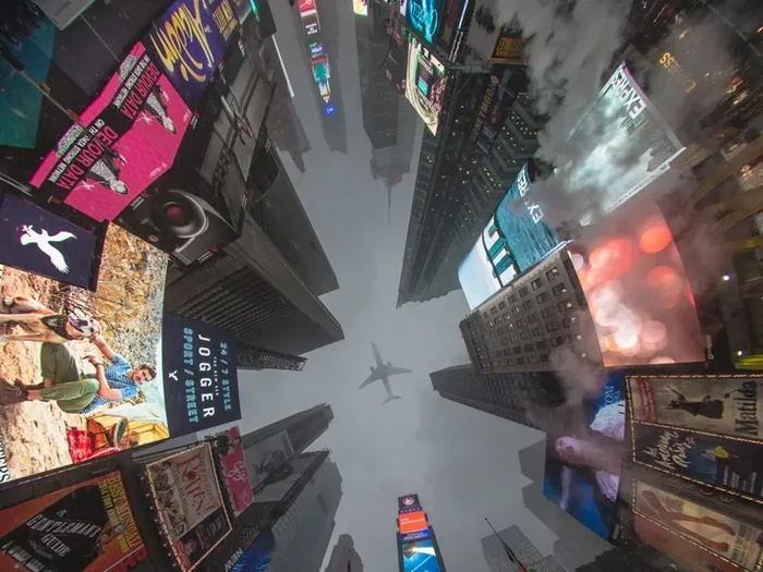 Pemandangan pesawat saat melintas dipotret dari Times Square, New York, Amerika Serikat. Bukan AI, tapi karena momennya sempurna. Foto: via BrightSide