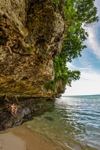 Saat berkunjung sore hari itu, pengunjung cukup banyak. Sebagian pengunjung bermain air, sebagian lain berjemur dan banyak juga yang sekadar jalan-jalan dan berfoto ria. Saya mendapati seorang wisatawan sedang duduk sendiri di bawah karang yang tinggi besar sambil mengamati pantai. Ekspresi tubuhnya yang santai menarik perhatian.