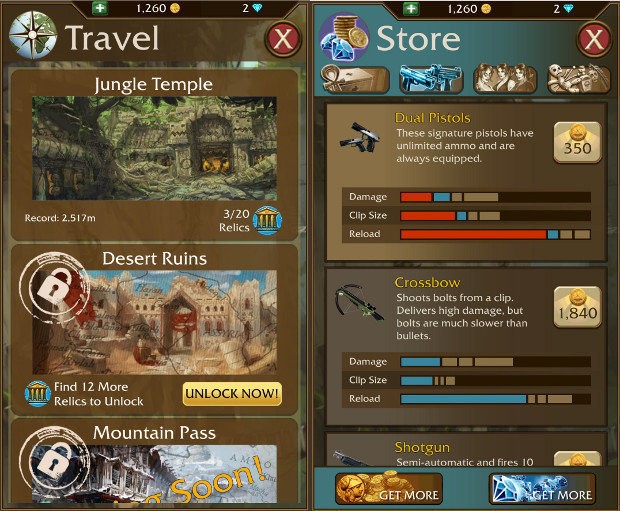 Ketika membuka menu Travel maka Anda akan menemukan adanya tiga lokasi yang telah disiapkan oleh Square Enix, yakni Jungle Temple, Desert Ruins, dan Mountain Pass. Tiga lokasi inilah yang nantinya akan menjadi tempat Lara Croft untuk berlari. Hanya saja, pertama-tama Anda tentu baru bisa menggunakan satu lokasi saja, yakni Jungle Temple.