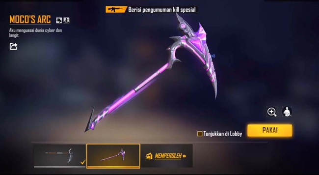 Jika berbicara tentang Scythe - Moco's Arc, seperti namanya skin ini memiliki tema warna, yang mirip dengan karakter Moco di Free Fire. Lalu menariknya adalah pemain bisa memamerkan di Lobby sebelum bermain.