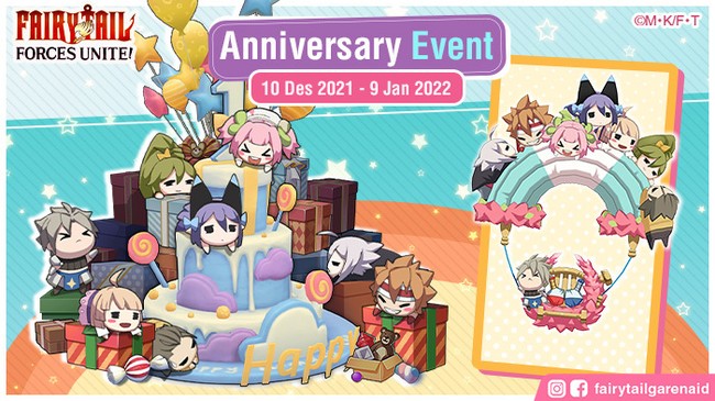 Selain hadiah Login Spesial tersebut, kalian juga dapat mengikuti Anniversary Festival yang berlangsung dari tanggal 10 Desember 2021 - 9 Januari 2022. Kumpulkan Anniversary Coin, dengan menyelesaikan setiap misi dan ditukarkan dengan Mount Special Anniversary. Berikut detail Event Fairy Tail: Forces Unite! Anniversary Festival