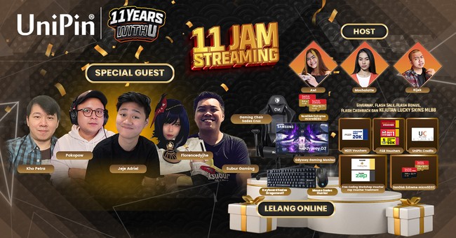 Adapun puncak acara perayaan HUT UniPin ke-11 tahun akan berlangsung melalui sesi 11 jam live stream nonstop yang dapat disaksikan pada channel YouTube UniPin Gaming. Live stream akan dimulai pada pukul 11. 00 WIB.