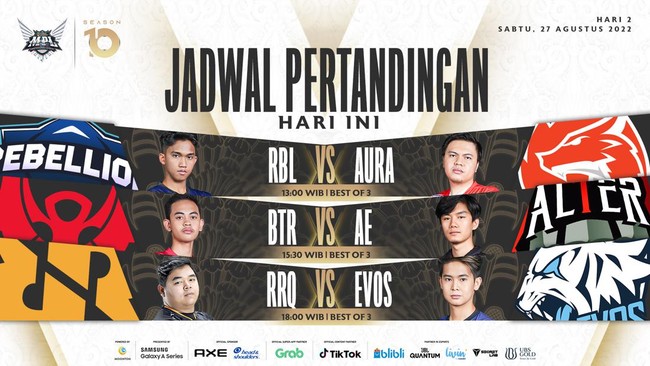 Kemudian laga selanjutnya, pertarungan sengit dari Bigetron Alpha vs Alter Ego. Setidaknya total ada tiga match yang akan diselenggarakan, dan berikut jadwal MPL ID S10 hari ini, dikutip detikINET dari situs resmi id-mpl, Sabtu (27/8/2022).