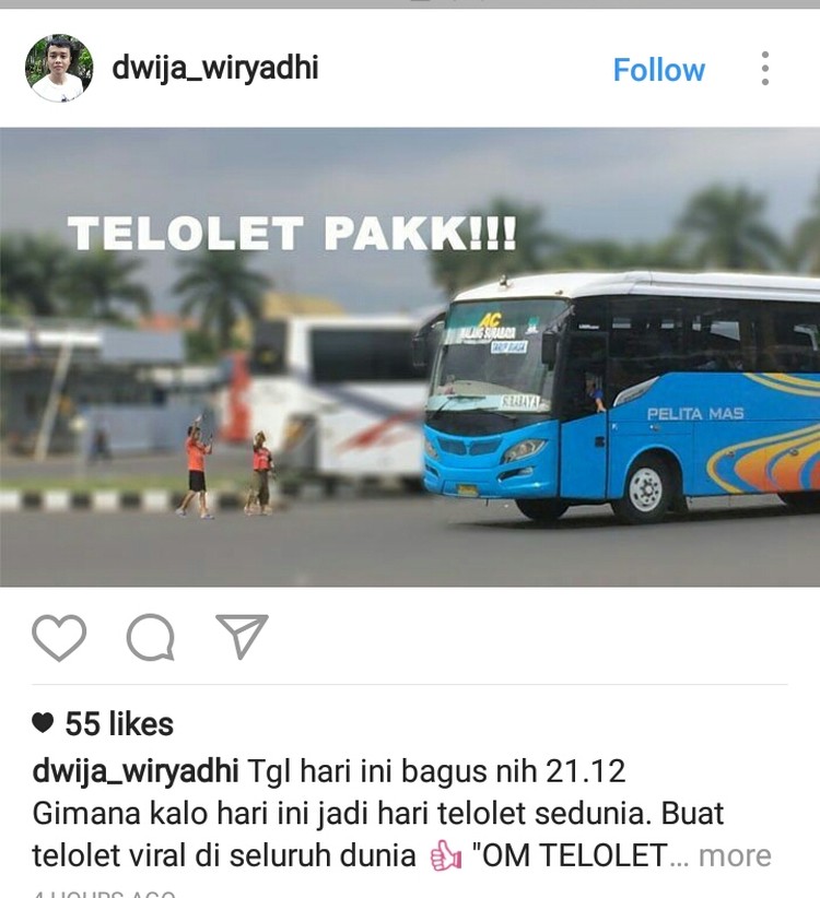 Seseorang membuat lelucon yang menggambarkan kegigihan para pemburu bus telolet dengan tulisan 'Pantang Pulang Sebelum Telolet Datang' (Foto: Instagram)