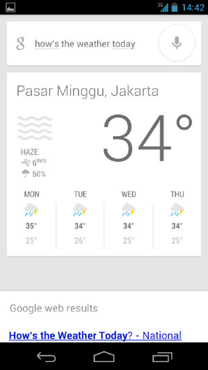 Melalui Google Now pengguna juga bisa melakukan pencarian di web dengan perintah suara, hasil cepat dan penelusuran berdasarkan mesin pecari di Google.Β