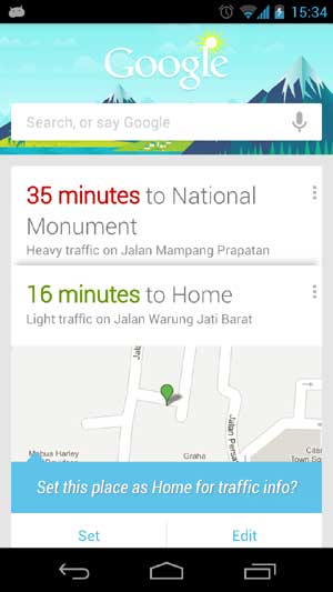 Contoh kasus saat detikINET ingin beranjak dari rumah di Bekasi menuju kantor di Warung Buncit, Jakarta Selatan. Google Now secara otomatis melaporkan kondisi jalan yang macet atau lancar, serta perkiraan waktu sampai di tempat tujuan. Kemudian informasi tambahan lain berupa kondisi cuaca saat itu dan lokasi sekitar yang mungkin asyik untuk dikunjungi.