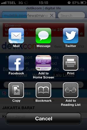 Tambahan fitur berbagi juga terjadi di browser Safari ini -- mirip dengan apa yang ada di 'Photo' -- namun dengan tambahan seperti Copy dan Reading List. Anda juga bisa langsung mengirimkan link bacaan tersebut melalui Twitter dan Facebook.