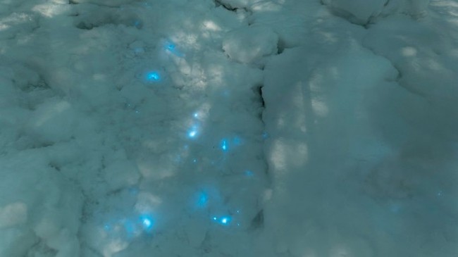 Cahaya itu berwarna biru pucat yang indah. Ilmuwan pun penasaran sehingga mereka langsung menyelidikinya dan menyimpulkan bahwa penyebab salju bercahaya ini adalah hewan-hewan kecil yang dinamakan copepoda.