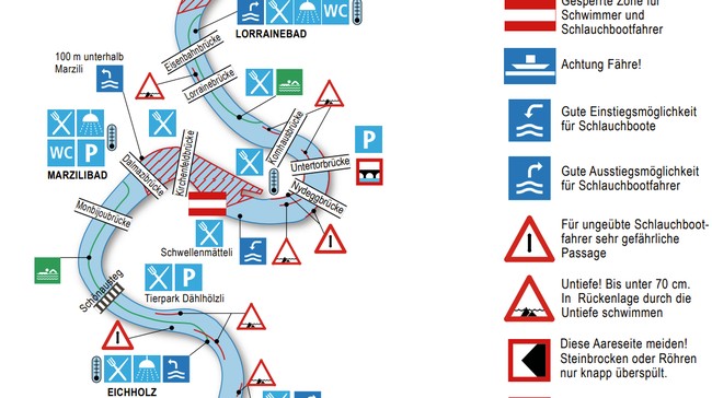 Gambar peta di atas adalah bagian dari Sungai Aare di Kota Bern mulai dari Eichholz yang mengalir ke utara sampai Stauwehr (Pintu Air) Felsenau. Titik berbahaya ditandai dengan warna merah.